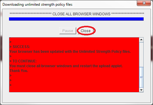 If you don't already have the required JCE files, the applet will download them for you. You will just need to close and restart your browser if you get this screen.