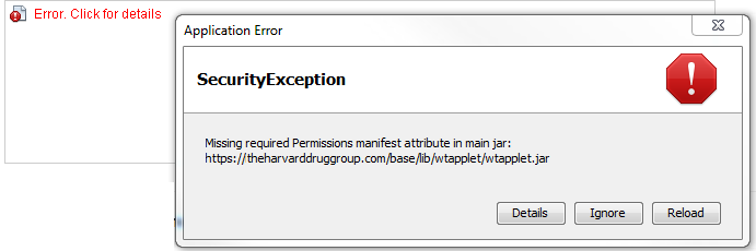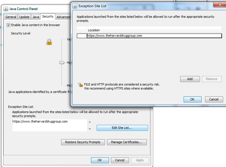 Due to increased security with Java you may receive this prompt, if you do you will need to add theharvarddruggroup.com to your Java Exception List: